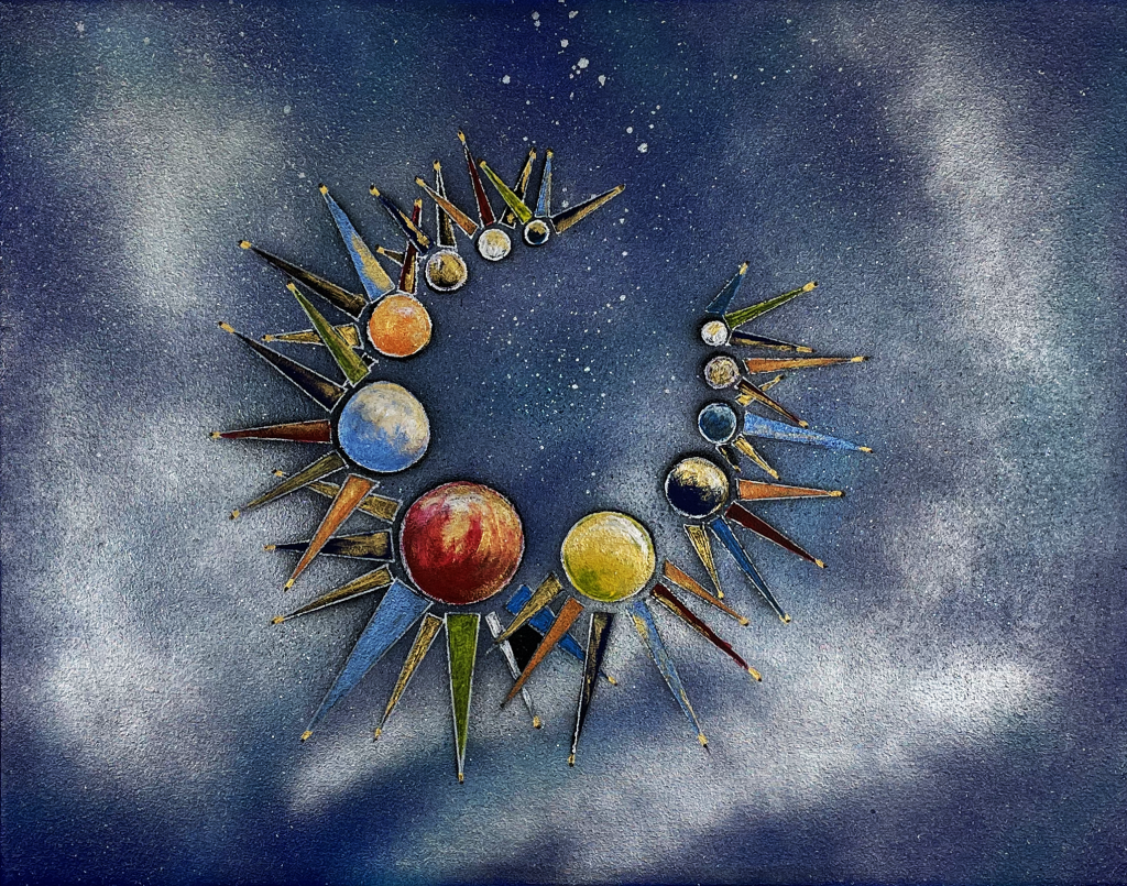 El diseño de Corona Planetaria y sus múltiples usos representan un paso extraordinariamente importante en la evolución de las composiciones. Una sola figura que desde su complejidad y a la vez simpleza, que fue creada en base a solo formas básicas, círculos y triángulos, abre la puerta a una serie de trabajos en ambientes y planos diversos. Esta obra juega con la idea de la creación en el infinito del cosmos.