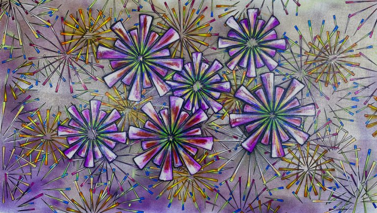Construyendo múltiples elementos para desarrollar las texturas, en las Andrómedas la profundidad mas que el color es esencial. De la línea a las formas circulares, cada elemento intenta asociar al patrón y su repetición la idea de la constante, del orden, de la construcción.