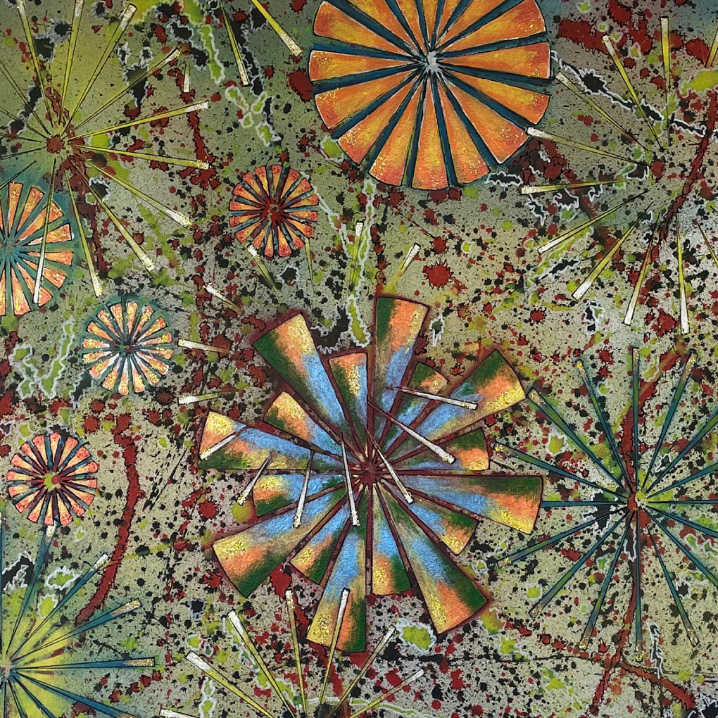 De los prados de flores de la primavera a los colores del invierno, las formas dispersas de este trabajo representan el fin del color, el inicio de los matices en verdes oscuros y azules grisáceos, en el inicio del invierno, ya con la nostalgia del color que nos deja.