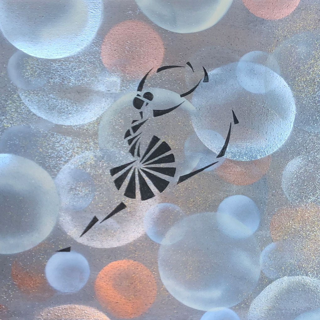 Integrando los ensayos iniciales de formas geométricas y trabajo en spray, esta serie de bailarinas busca dibujar el trabajo de taller, pero en la máxima representación del arte de la danza, ese instante en el que se desafía la gravedad, y vemos con admiración volar a nuestras bailarinas.