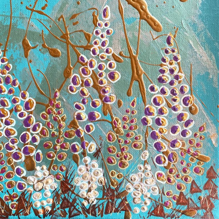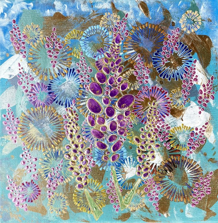 Patagonia es una serie que está en sus inicios, siendo las primeras tres obras un tributo a los colores de los Lagos General Carrera y O´Higgins; los Coigües y los Lupinos. En este trabajo la flor Patagónica por excelencia, el “Lupino” emerge vibrante entre los azules y verdes de los campos.